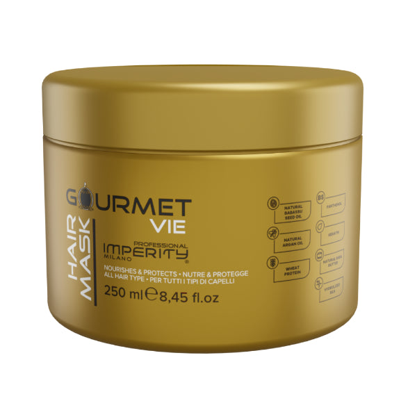 Imperity Gourmet Vie Hair mask ensures optimum hydration, the resiliency of the hair is improved by that the mask is processed with silk protein and shea butter. Keratin, Argan and palm oil make hair silky, shiny, full and healthy. Enriched with a delicious sweet, fresh scent resembling La Vie belle perfume and is suitable for every hair type.